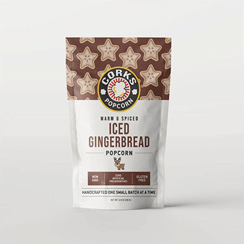 ICED GINGERBREAD POPCORN - They'll wrap themselves in the warmth of the season with Iced Gingerbread Popcorn—golden, crunchy kernels kissed with cozy gingerbread spices and finished with a velvety vanilla icing. Each bite feels like a holiday hug, sweet, spiced, and wonderfully comforting. Gluten-free. Non-GMO, No preservatives. Women-owned small business. Made by Corks Popcorn in Georgia. 4.5 oz.