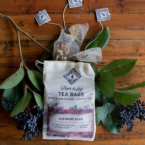 Helpful for an immune boosting tonic for all-season vitality. This berry and herb infusion containing elderberries & echinacea is a favorite with our children during stuffy nose season. Ingredients: Elderberries, Ginger, Lemon Rind, Hibiscus, Cinnamon, Echinacea, Licorice, Cloves. Caffeine-free. Handcrafted by Piper and Leaf in Alabama. 9 silky pyramid sachets ready to brew. Family-owned small business.