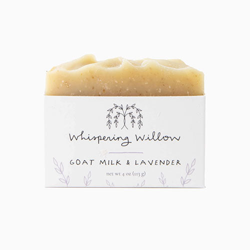 LAVENDER GOAT MILK SOAP - Gentle aroma that leaves you calm and grounded. The rich lather from blend of organic oils, shea butter, and ground oats gently cleanses and exfoliates while moisturizing and providing essential vitamins and nutrients. Handmade by woman-owned small business Whispering Willow in North Carolina. Cruelty-free. 7.2 oz.