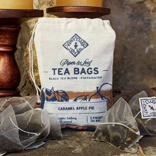 CARAMEL APPLE PIE TEA - Freshly harvested, late fall, cellar-root apples lend a crisp note to the decidedly creamy, mellow, and caramel-laced black tea. Ingredients: Ceylon Black Tea, Apples, Cinnamon, Ginger, Orange Rind, Star Anise, Licorice, Cloves, Organic Caramel Flavor, Black Pepper. Caffeinated. Handcrafted by Piper and Leaf in Alabama. 9 silky pyramid sachets ready to brew.