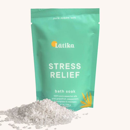 - STRESS RELIEF SALT SOAK - 100% pure pink grapefruit, peppermint, lemongrass, and rosemary - an invigorating blend to uplift the mood, soothe the senses, and promote mental clarity. USP-grade magnesium sulfate helps relax tired muscles, calm the nervous system, and restore balance to both body and mind. Made by woman-owned small business Latika Beauty in Texas. 4oz.