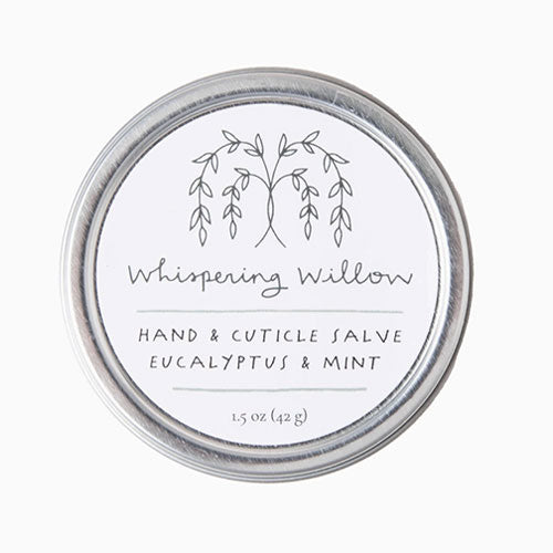 EUCALYPTUS MINT HAND CREAM - Handcrafted in small batches in North Carolina by Whispering Willow. WBENC certified Woman owned business, certified cruelty-free through Leaping Bunny, and members of 1% for the Planet. Organic Sunflower Oil, Organic Beeswax, Organic Jojoba Oil, Organic Sweet Almond Oil, Organic Essential Oil. 4 oz. Woman-owned small business.