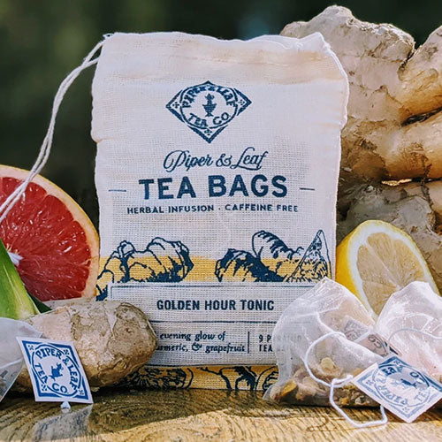 GOLDEN HOUR TONIC TEA - A spiced evening glow of ginger, turmeric, and grapefruit. There’s a moment: a fleeting, agonizingly short but sweet, transitory moment. It sends the sun on its daily course. It also returns to punctuate the daily doldrums. The warm ginger coaxes the tongue awake, the grapefruit pulsates life into your senses, and gentle turmeric wraps around like a comforting pneumatic gust. This instant - a vision encapsulated, accentuated - this is the Golden Hour Tonic. Ingredients: Ginger, Turmeric, Rosehips, Pineapple, Papaya, Apple, Lemon Rind, Orange Rind Hibiscus, Spearmint, Grapefruit Oil. Caffeine-free. Handcrafted by Piper and Leaf Tea in Alabama. Family-owned small business. 9 pyramid sachet tea bags ready to brew.