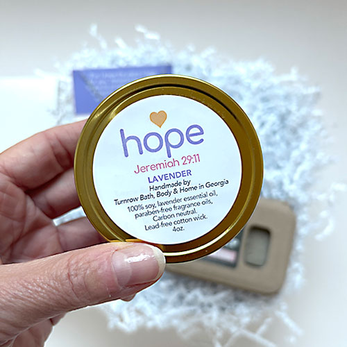 • LAVENDER CANDLE - 100% soy. Non-toxic. Carbon-neutral. Lead-free cotton wick. Made with essential oils and paraben-free fragrance oils for a calm lavender aroma. Hand-poured into a travel tin with lid. Handmade by Turnrow Bath, Body. & Home in Georgia.