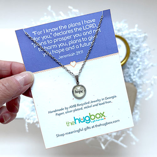 • HOPE NECKLACE - Handmade by AMB Recycled Jewelry in Georgia. This "hope" pendant necklace was created using a book clipping from an upcycled, damaged book. Clipping is preserved under a glass dome cabochon, then set in a stainless steel bezel. It comes on a matching 18" stainless steel chain. Nickel and lead-free.
